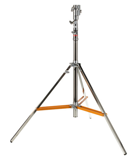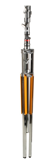 El soporte combinado Matthews Double Riser Hollywood, con acabado plateado, tiene un ancho de 109 cm y patas extralargas para mayor estabilidad. Alcanza una altura máxima de 3,4 m y admite luminarias con pines junior de 3,1 cm o pines baby de 1,6 cm.